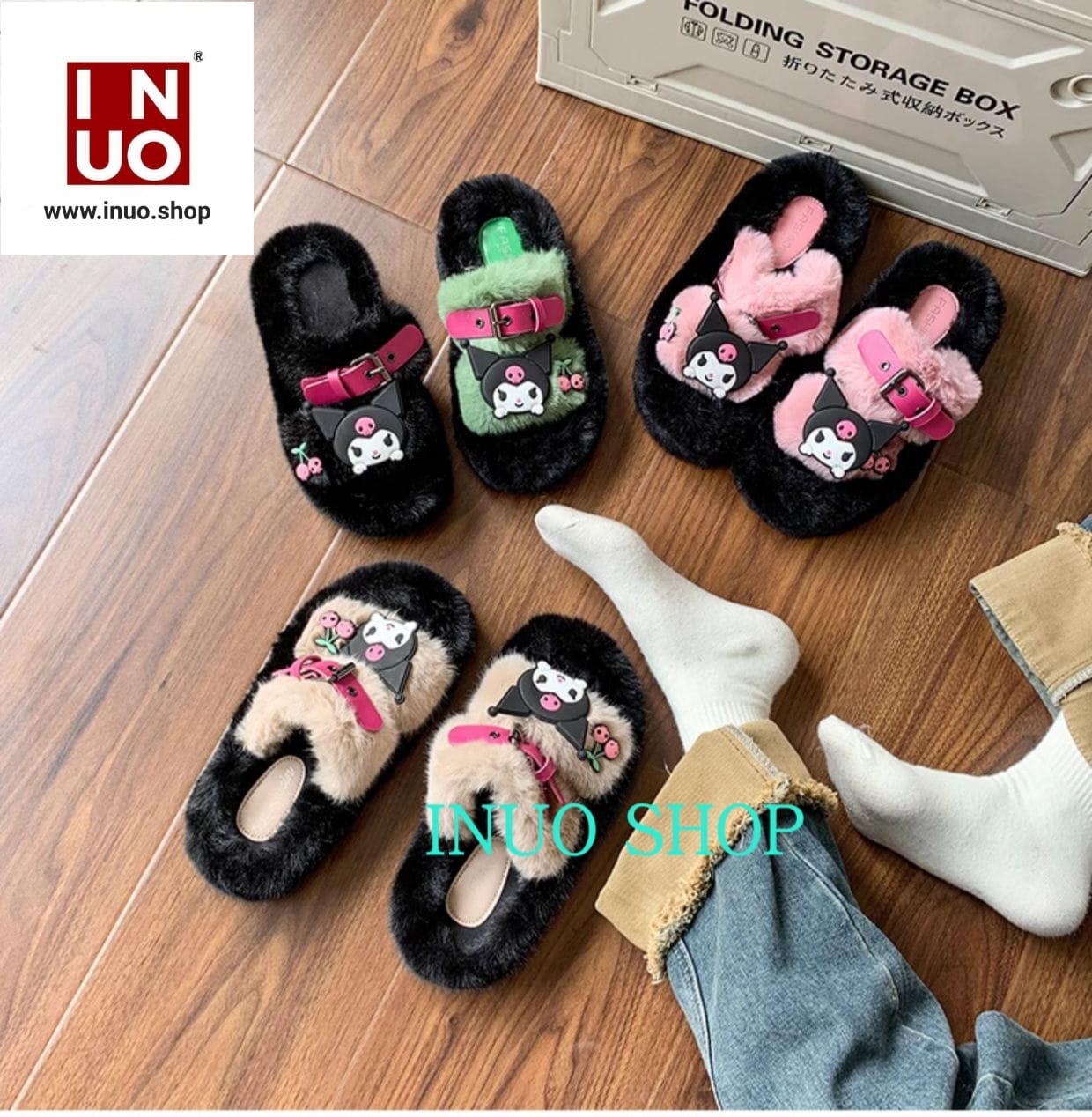 Sanrio kuromi zapatillas de felpa cálidas para invierno ❄️ pantufla para interior de casa 🏡, bonito zapato con cinturón y remaches decorativos.